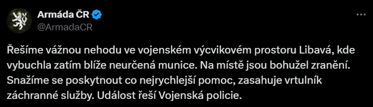 „Řešíme vážnou nehodu ve vojenském výcvikovém prostoru Libavá, kde vybuchla zatím blíže neurčená munice. Na místě jsou bohužel zranění. Snažíme se poskytnout co nejrychlejší pomoc, zasahuje vrtulník záchranné služby. Událost vyšetřuje Vojenská policie,“ dodává mluvčí armády.