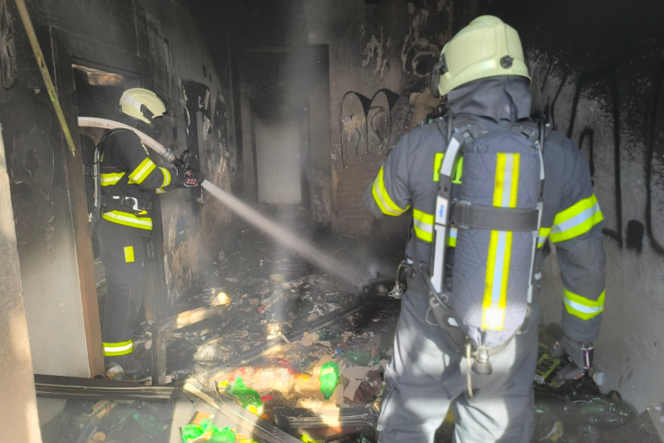 Zásah hasičských jednotek probíhá v dýchací technice. V budově se naštěstí nenacházejí žádné osoby.
