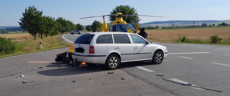 Střetlo se tam osobní auto s motorkářem! Ten utrpěl vážné zranění a byl letecky transportován do nemocnice. Okolnosti nehody i nadále vyšetřují dopravní policisté.