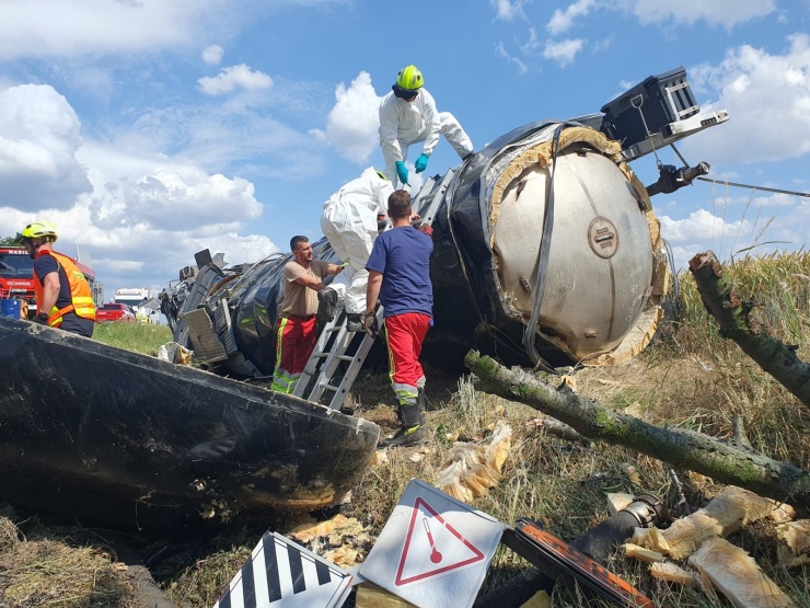 Po dojezdu první jednotky požární ochrany na místo bylo průzkumem zjištěno, že jde o dopravní nehodu dodávkového vozu a cisterny, která se po střetu převrátila na bok, zároveň z ní začal vytékat převážený asfalt. Řidič dodávky vyvázl bez zranění. Během vyprošťování řidiče cisterny pracovalo druhé družstvo na zastavení unikajícího asfaltu a na chlazení už vyteklé hmoty. Unikající horký asfalt navíc ohrožoval nádrž s naftou. Tu museli hasiči také ochlazovat a následně přečerpat do sudů, které si přivezli v kontejneru určeném na tyto typy událostí.
