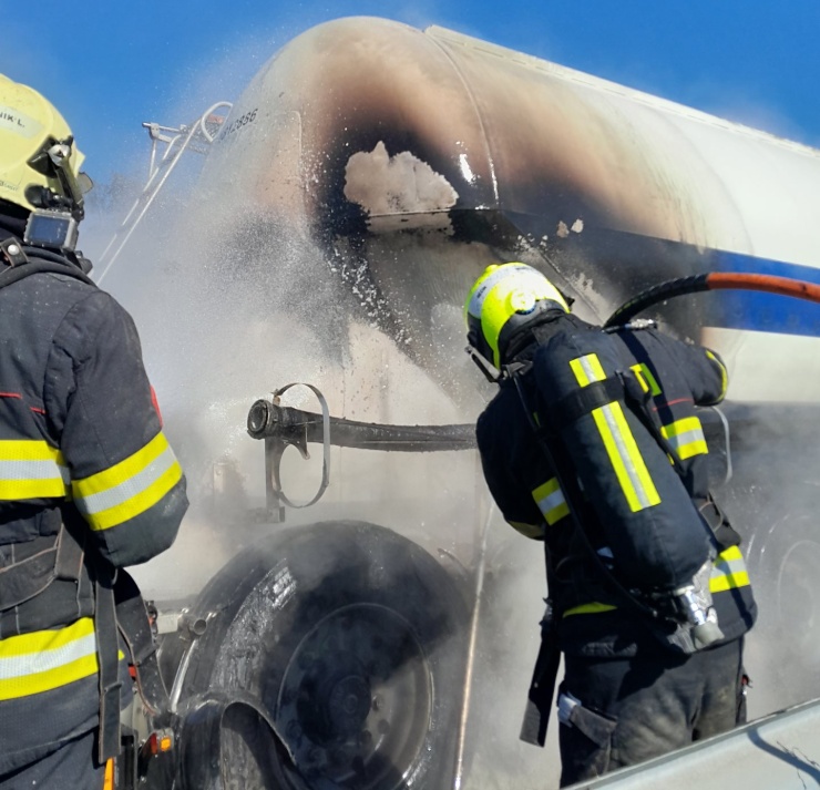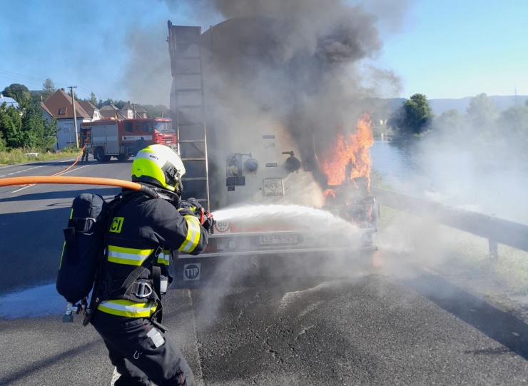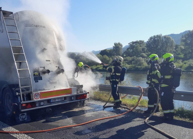 DĚČÍN – Jednotky hasičů likvidují požár pneumatiky cisterny převážející cement u Děčína. Nikdo nebyl při požáru zraněn. Cement ale znečistil vozovku.