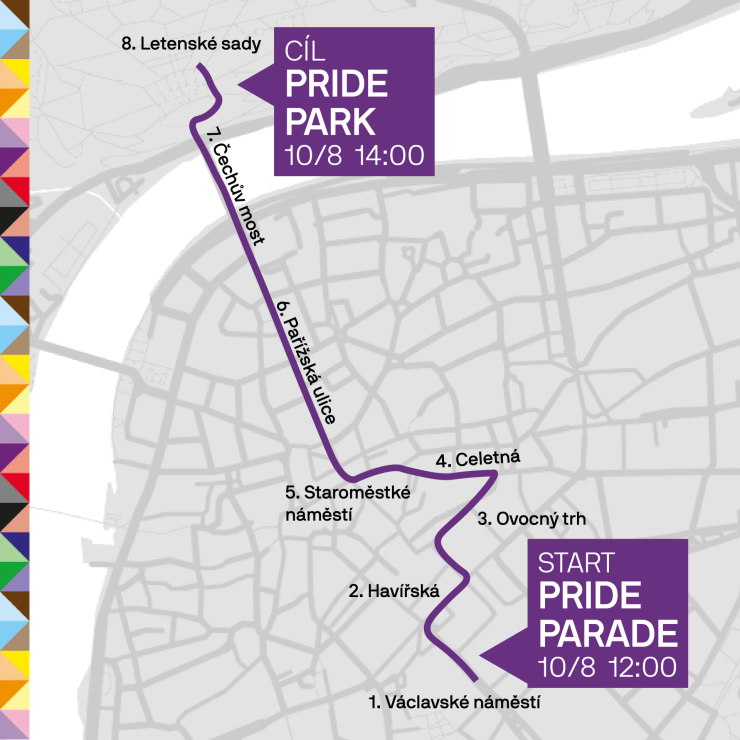 Půjdeme ulicí Na Příkopě, Havířskou, přes Ovocný trh, Celetnou, Staroměstské náměstí a Pařížskou k Čechovu mostu. Za ním vystoupáme schody na Letnou a cílovou rovinkou šup do Pride Parku.