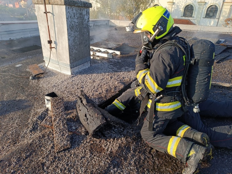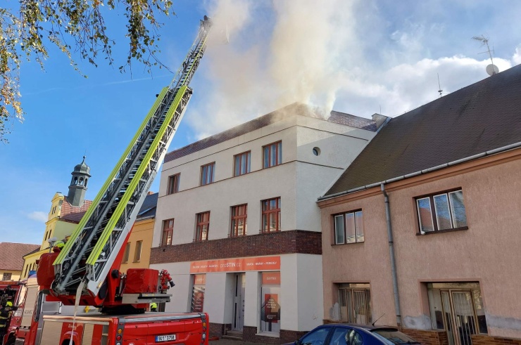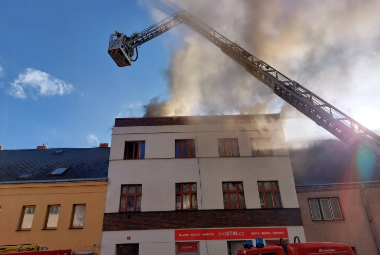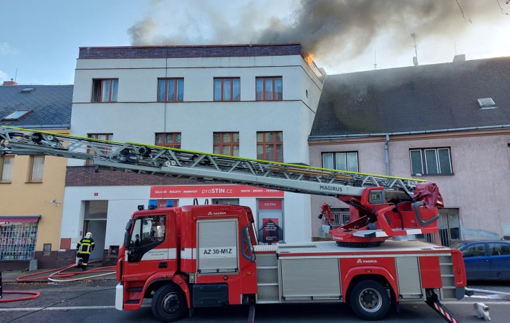 OBRAZEM: V Chabařovicích hořela střecha bytového domu! Hasiči zachránili psa