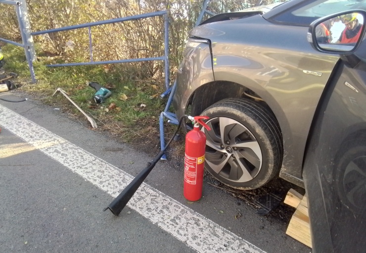 Řidič i spolujezdec nemohli ven, kolizi ovšem zvládli bez zranění. Přivolaní hasiči odřezali rozbrušovací pilou nebezpečný kus zábradlí, aby pomohli pasažérům a dostali je z havarovaného automobilu. Zároveň hasiči tak mohli odpojit baterii a zabezpečit místo proti vzniku požáru.