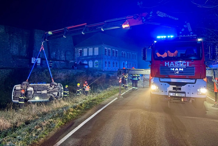 Na namrzlé vozovce v Josefovském údolí havarovalo osobní auto a skončilo na střeše