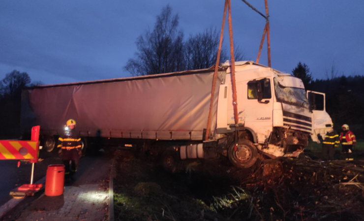 MOSTY U JABLUNKOVA – Při noční nehodě kamionu museli hasiči vyprostit nejen jeho řidiče, ale i samotný kamion.
