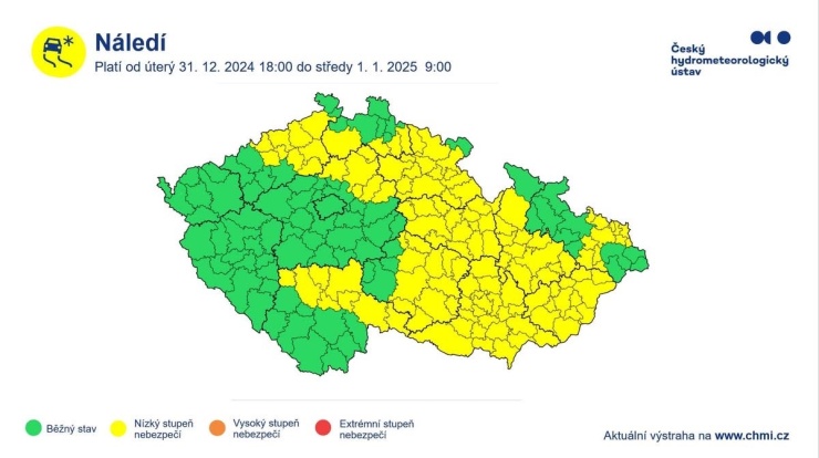ČESKO – Během silvestrovské noci a na Nový rok ráno (1. 1. 2025) očekávají meteorologové v místech se slabším větrem při mrznoucích mlhách nebo i při jasné obloze na komunikacích tvorbu námrazy (jíní), která se může zajezdit do tenké kluzké vrstvy náledí.