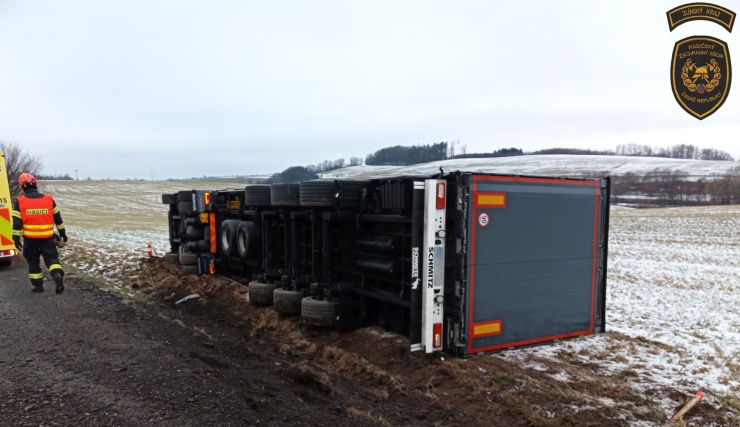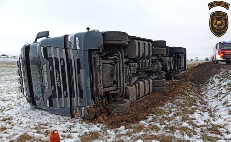 Po příjezdu na místo hasiči zjistili, že mimo cestu leží na boku vyvrácený kamion. Řidič se z kabiny dostal před příjezdem hasičů a do péče si jej převzala posádka zdravotnické záchranné služby. Hasiči u vozu provedli protipožární opatření a informovali zástupce životního prostředí o možném úniku provozních kapalin do půdy, neboť auto leželo na nádržích a do zvednutí kamionu zpět na kola nelze únik vyloučit.