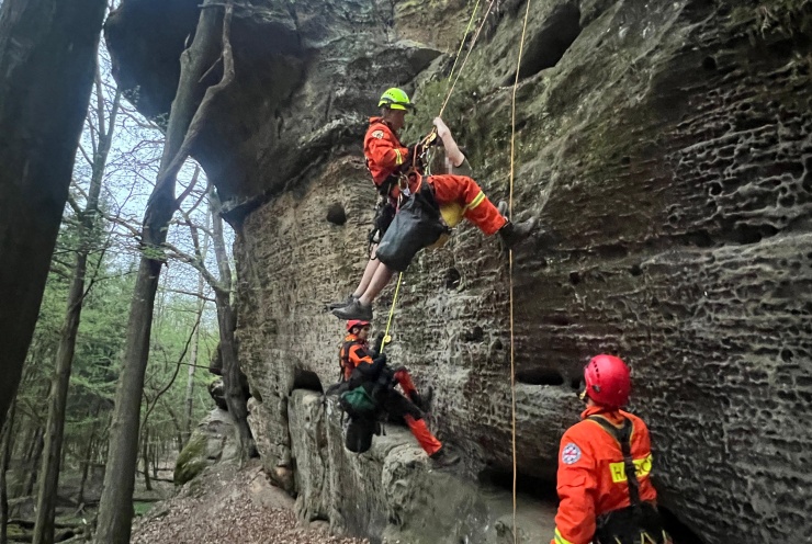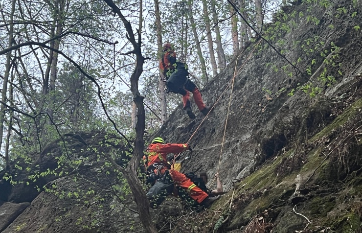 MĚLNICKO – K uvízlé osobě a psovi na skalním převisu se slanila lezecká skupina z centrální hasičské stanice Mělník. Pomocí lanových technik oba dva dostali bezpečně dolů.