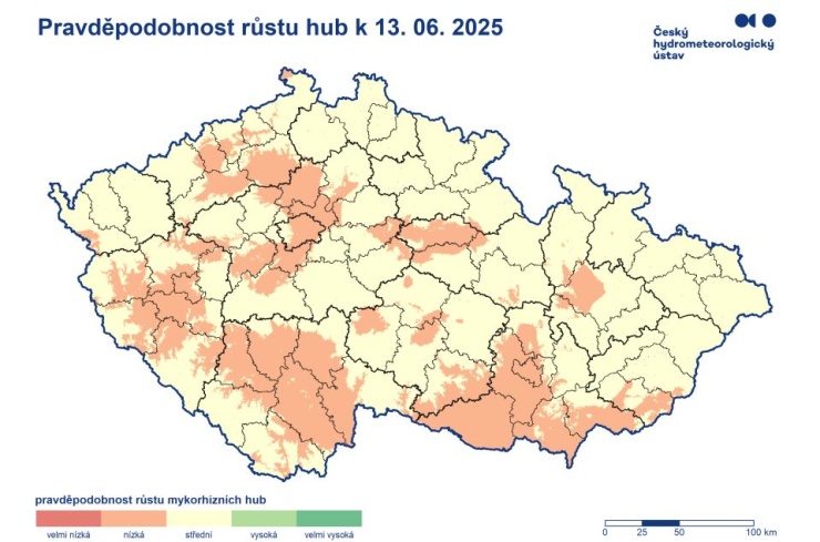 ČESKO – Vzhledem k tomu, že nám v předchozích dnech zapršelo a zároveň je i teplo, začaly růst houby. Mapka nám vyjadřuje vhodnost vláhových podmínek pro růst hub a pravděpodobnost růstu hub je nyní na části území ČR na třetím stupni (z 5-škálové stupnice) tj. střední, např. v severních a východních Čechách, na Vysočině, na Šumavě či na severní Moravě.