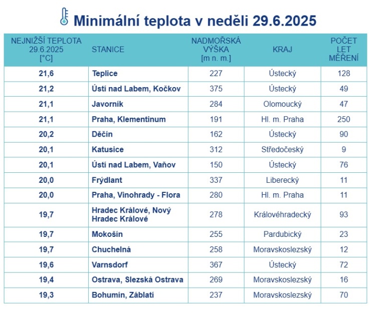 ČESKO – Noc na dnešek byla teplá, na několika stanicích tropická, to znamená že teplota neklesla pod 20 °C.