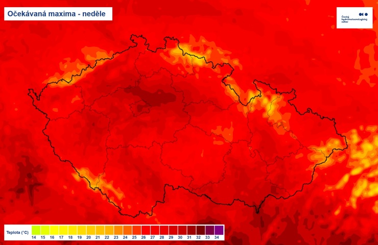 Během dne vystoupí teploty na 27 až 32 °C, nejtepleji bude na jihu Moravy a v Polabí, na horách kolem 1000 m n. m. se budou maxima pohybovat kolem 22 °C. K tomu nás čeká polojasná, přechodně až oblačná obloha, na severu a severovýchodě republiky se mohou objevit slabé přeháňky.