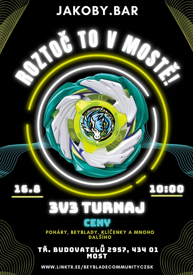 V soboru 16. srpna 2025 se v Mostě od 10.00 hodin uskuteční hlavní 3V3 turnaj BeyBlades pod názvem ROZTOČ TO V MOSTĚ, a to v JAKOBY.BARu na Tř. Budovatelů 2957.