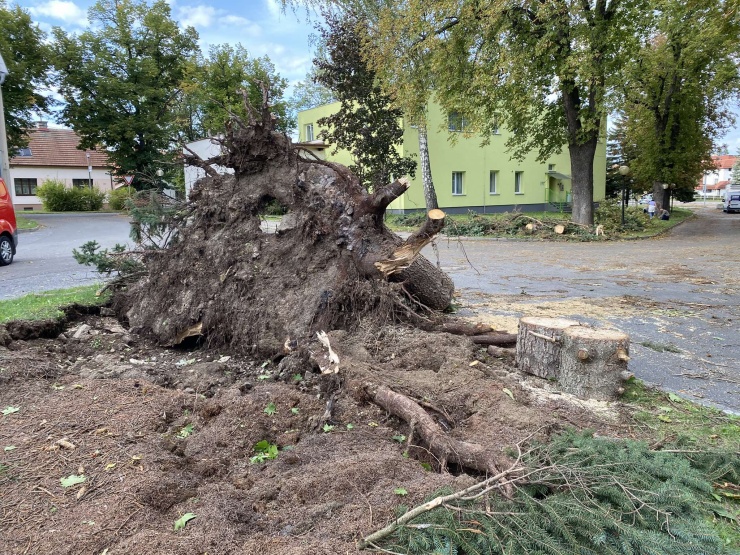 A jak silný vítr včera ve Vysokém Mýtě působil? Dle terénního průzkumu a odhadu škod dle manuálu Mezinárodní Fujitovy stupnice (IF) byly nejvýraznější škody odhadnuty na stupeň IF1 (na snímku níže hlavně zlomená větší lípa). To odpovídá možnému krátkodobému větru přibližně o rychlosti kolem 40 m/s, což je kolem 140 km/h. Kromě škod na stromech byly zaznamenány i škody na majetku (poškozené střechy a auta), naštěstí ale žádná újma na lidském zdraví.
