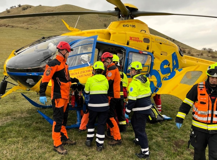 Vzhledem k prudkému svahu nebylo možné, aby na místě přistál vrtulník Letecké záchranné služby. Hasiči – lezci z CHS Ústí nad Labem zraněného muže zajistili do nosítek. Následně byl v podvěsu spolu s lékařem LZS ÚK vyzvednut vrtulníkem a transportován na bezpečné místo pod kopcem, odkud byl po poskytnutí další neodkladné lékařské péče přeložen do vrtulníku a odvezen do nemocnice v Ústí nad Labem.