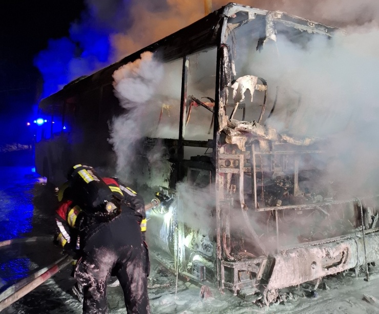 Oheň přivolaní hasiči zlikvidovali nasazením 2 útočných proudů (C proud + vysokotlak s přimísením pěny), využili také dýchací techniku. Událost se naštěstí obešla bez zranění, autobusem jel pouze řidič, který stihl vůz, které pohltily plameny včas opustit.