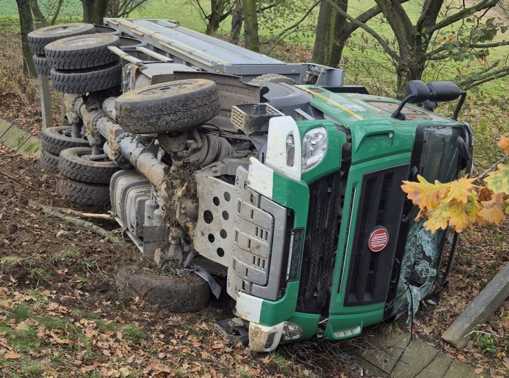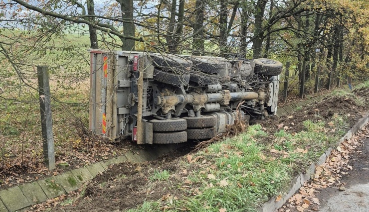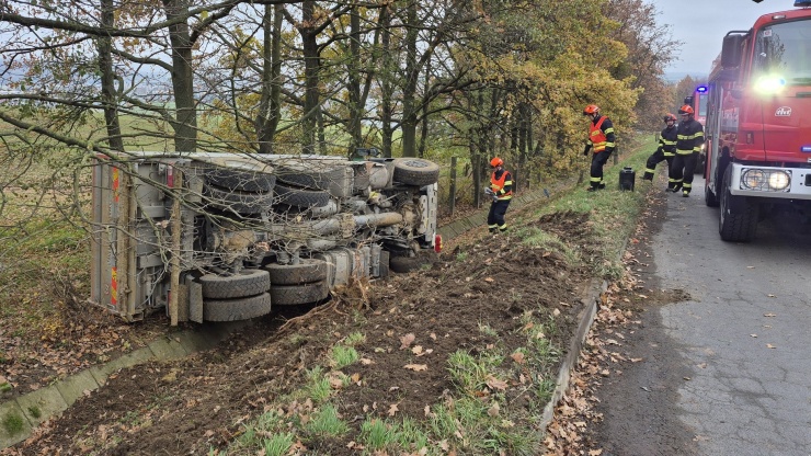 OTROKOVICE – Profesionální hasiči ze Zlína a Otrokovic zasahovali dnes dopoledne v Otrokovicích – Kvítkovicích u havárie nákladního vozidla, se kterým sjel řidič ze silnice a převrátil se na bok.