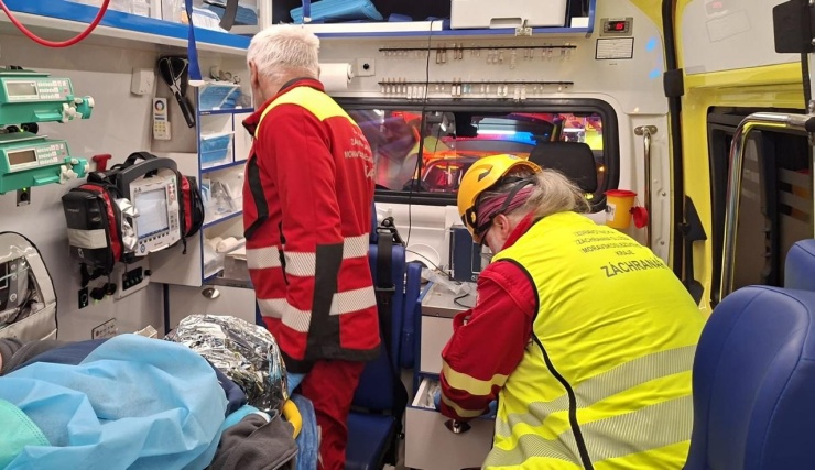 Dvaatřicetiletý muž utrpěl poranění hlavy, páteře, hrudníku, horní i dolní končetiny. Záchranáři provedli nutné znehybnění, nitrožilně podali potřebné léky a infuze, a zajistili zraněnému tepelný komfort. Do zdravotnického zařízení byl přepraven letecky.