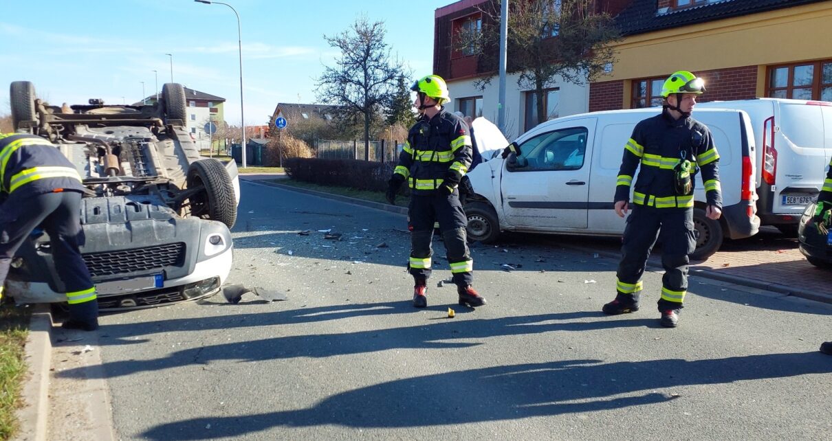 Jedno vozidlo skončilo na střeše. Dvě zraněné osoby si převzala ZZS. Hasiči provedli protipožární opatření. Příčinu dopravní nehody vyšetřují policisté.