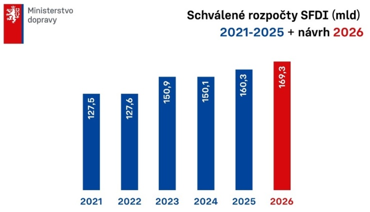 ČESKO – Poslanecké sněmovna dnes ve třetím čtení schválila návrh rozpočtu Státního fondu dopravní infrastruktury (SFDI) pro rok 2026. Do dopravních výstavby stát investuje rekordních 169,3 miliardy korun, což je o 9 miliard více než byl schválený rozpočet fondu na rok 2025. Oproti původnímu návrhu předloženému minulou vládou aktuální verze rozpočtu posiluje národní zdroje o 26 miliard korun. Návrh nyní poputuje k podpisu prezidentu republiky.