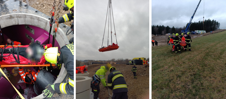 .Zraněnou osobu hasiči se záchranáři umístili do vakuové matrace a následně do košových nosítek. Zafixovaná zraněná osoba byla z jímky na vodu vytažena za pomoci staveništního jeřábu z hloubky cca 4 metry. Jednotka hasičů následně pomohla s jejím transportem do vrtulníku LZS.