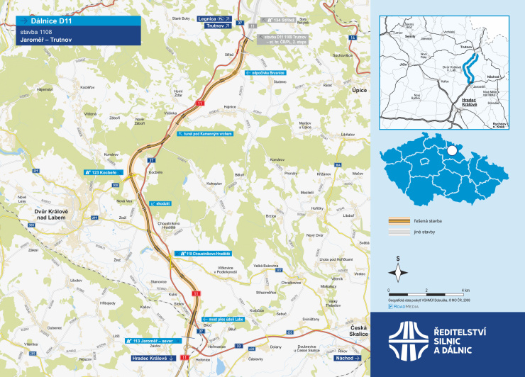 JAROMĚŘ / TRUTNOV – Ředitelství silnic a dálnic (ŘSD) začalo stavět poslední chybějící úsek dálnice D11. Je to 19,6 kilometru dlouhá část Jaroměř – Trutnov v Královéhradeckém kraji. Cena stavby, která vzešla z výběrového řízení, je 9,08 miliardy korun bez DPH. Řidiči by měli po novém úseku začít jezdit na podzim roku 2029, tím bude kompletně hotová celá dálnice D11 z Prahy až k polským hranicím, bude pak měřit 154 kilometrů.