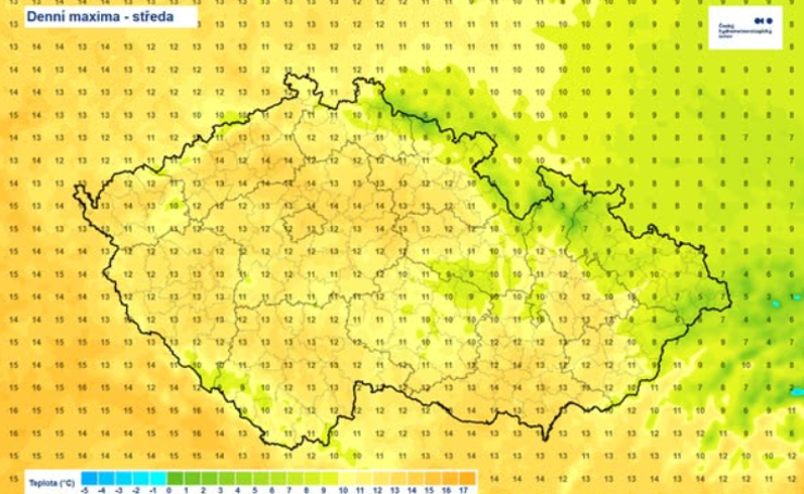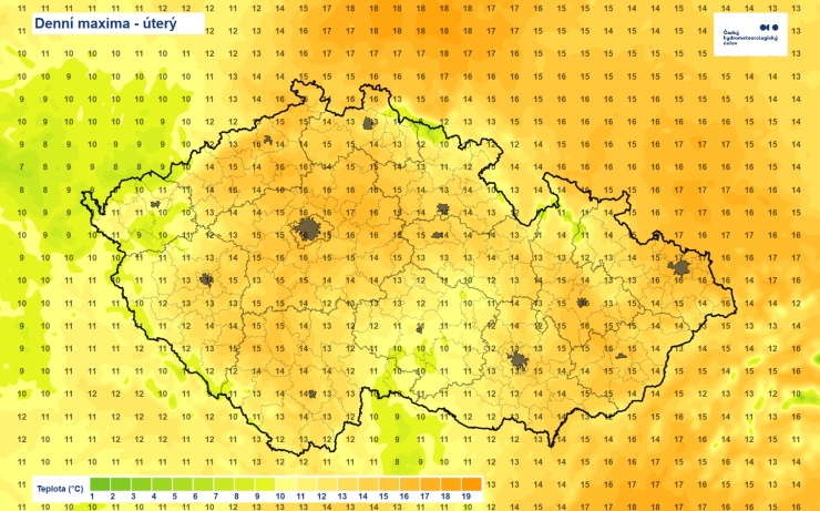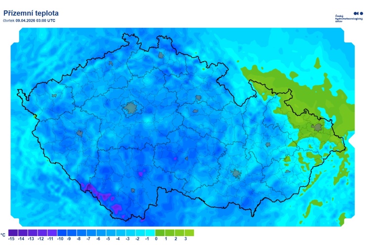 ČESKO – Pondělní ranní teploty se pohybují nejčastěji v rozmezí 8 až 4 °C. Nejtepleji je na jižní Moravě, kde teplota výjimečně dosahuje až 11 °C. Naopak na západě Čech teplota ojediněle klesá pod 4 °C. Nejvyšší ranní minima hlásí stanice Pohořelice (10,8 °C), Brno, Žabovřesky (10,8 °C) a Ždánice (10,6 °C). Nejnižší naopak Kvilda-Perla […]