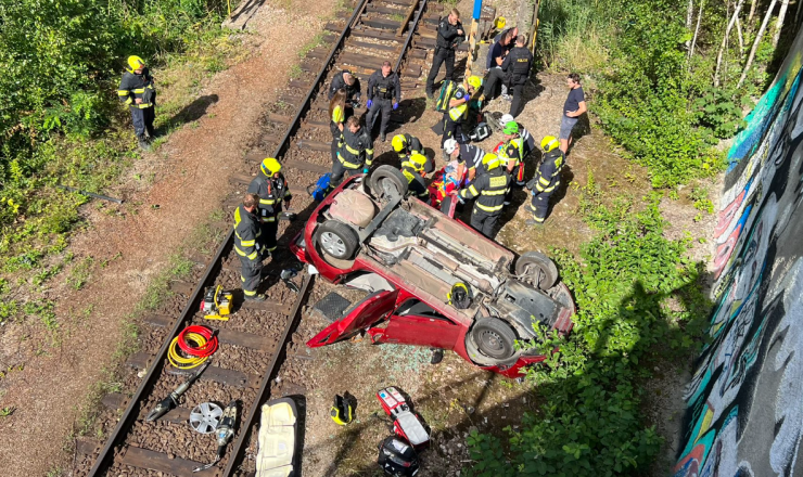 DRAMA: V Černokostelecké ulici v Praze sjel osobní automobil z mostu a skončil na střeše na kolejích