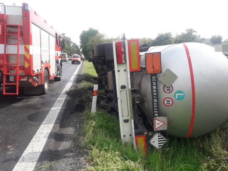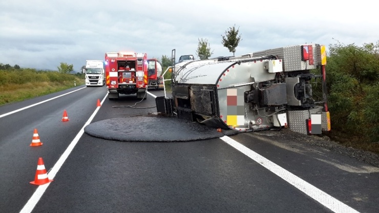 Cisterna převážející tekutý asfalt se převrátila na bok