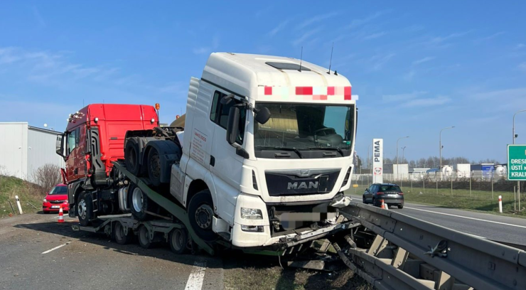 Na dálnici D8 ve směru na Ústí se střetla dvě nákladní vozidla! Jednoho řidiče hasiči museli vyprostit z havarované kabiny
