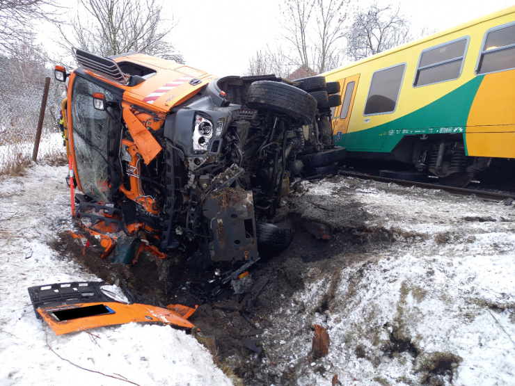DRAMA: Na železničním přejezdu u Rožné na Žďársku se střetl osobní vlak s nákladním automobilem, ten skončil na boku v příkopu