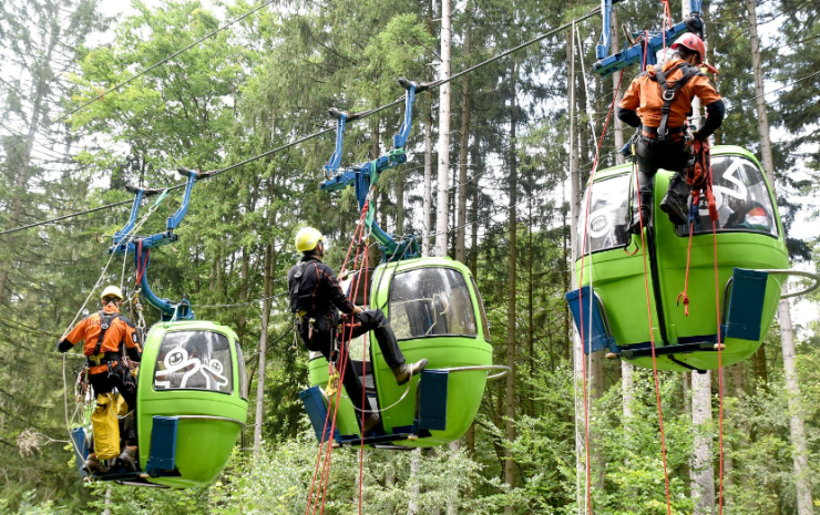 AKTUALIZUJEME OBRAZEM: Kabinková lanovka v Mariánských Lázních se zasekla, cestujícím museli pomoct přivolaní hasiči lezci