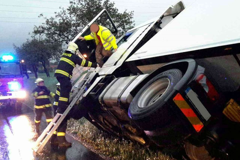 U převráceného kamionu ve Vysokém Mýtě zasahují hasiči