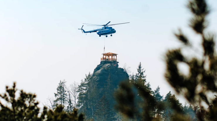 ZAUJALO NÁS: Zbrusu nový dřevěný altán na vrchol Mariiny vyhlídky v Jetřichovicích na Děčínsku instalovali dělníci pomocí vrtulníku
