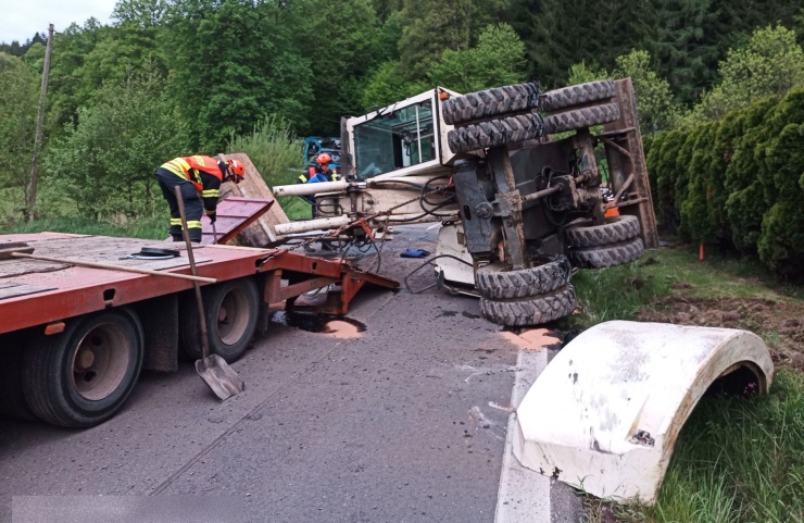 Na Vsetínsku spadl při transportu bagr z podvalníku a skončil na boku