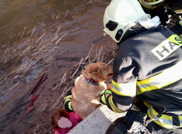 ÚPICE – V Úpici pomohli přivolaní profesionální hasiči Královéhradeckého kraje zachránit psa, který spadl do řeky Úpy. Pes doplaval na mělčinu, přes proud se ale bohužel nemohl dostat zpět. V pořádku ho posléze hasiči předali majitelce. Zdroj: HZS Královéhradeckého kraje