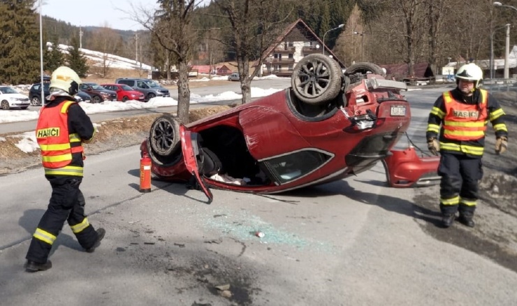 OBRAZEM: Ve Velkých Karlovicích havarovalo osobní auto, které skončilo na střeše