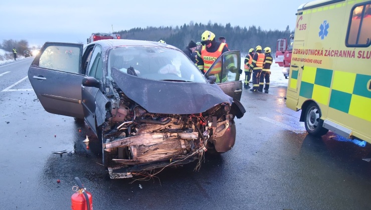 Dvě osobní auta se střetla na silnici I/6 u odbočky na Žlutice! Hasiči museli z havarovaného auta vyprostit asistenčního psa