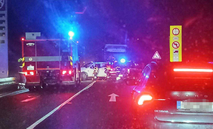 Na dálnici D2 u hranic se Slovenskem zůstal osobní automobil zaklíněný pod návěsem kamionu