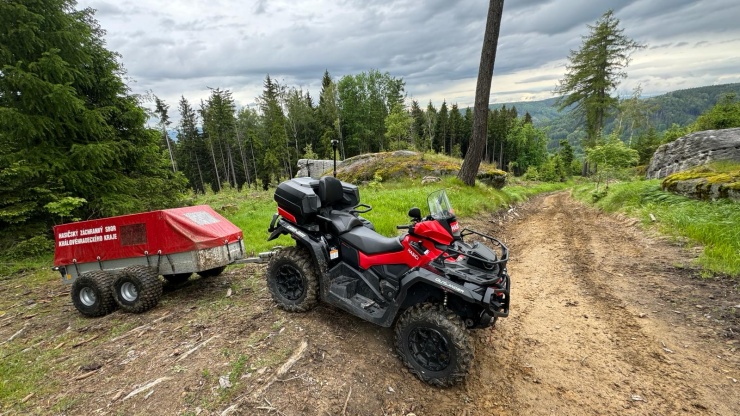 MACHOVSKÁ LHOTA – Hasiči pomohli záchranářům s transportem zraněné osoby z chaty v lesích v okolí Machovské Lhoty na Náchodsku. Pomocí čtyřkolky hasiči dovezli záchranářku na místo a pomohli s ošetřením zraněné osoby. Tu následně hasiči naložili do terénního vozidla majitele chaty a transportovali k vozidlu záchranářů. Zdroj: HZS Královéhradeckého kraje