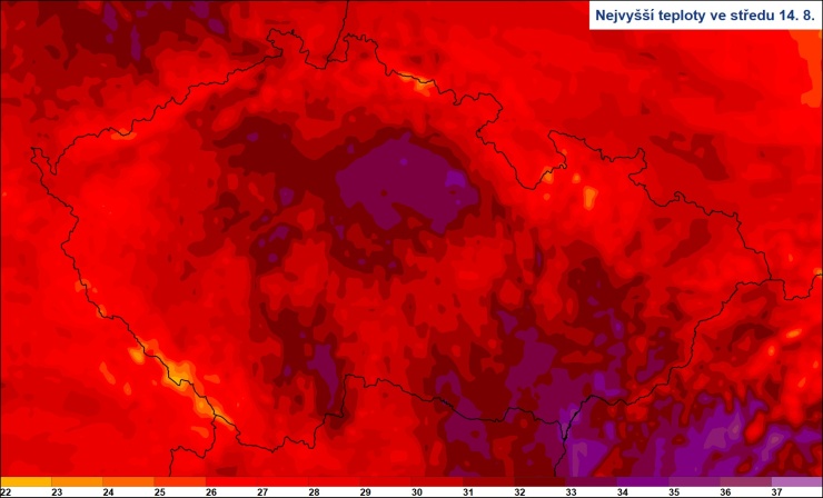 ČESKO – Dnešní teploty dosáhnou 34 °C, výjimečně ale mohou teploty vystoupat až na 37 °C. Nejtepleji bude podle meteorologů v severozápadních Čechách a také na jihu Moravy. Za studenou frontou, která začne přecházet dnes odpoledne, pak meteorologové očekávají ochlazení a víkendová maxima tak budou o deset stupňů nižší. Zdroj: Český hydrometeorologický ústav