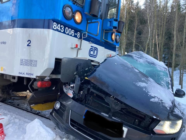 AKTUALIZUJEME: Řidič na Děčínsku uvíznul na zasněženém železničním přejezdu, stačil vystoupit ale strojvedoucí vlak už zabrzdit nestačil