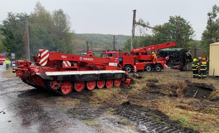 AKTUALIZUJEME OBRAZEM: Drážní hasiči pomocí vyprošťovacích tanků v Úpořinách na Teplicku druhým dnem zasahují u vykolejeného nákladního vlaku