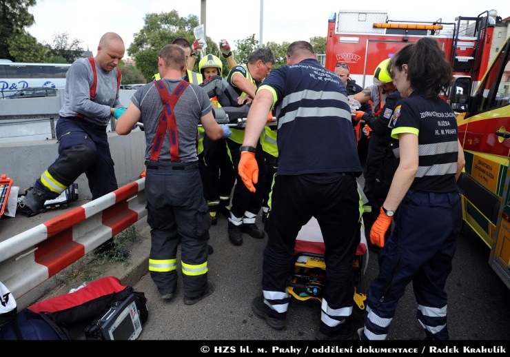 Hasiči v Praze pomohli záchranářům s transportem pacienta do sanitky po dopravní nehodě